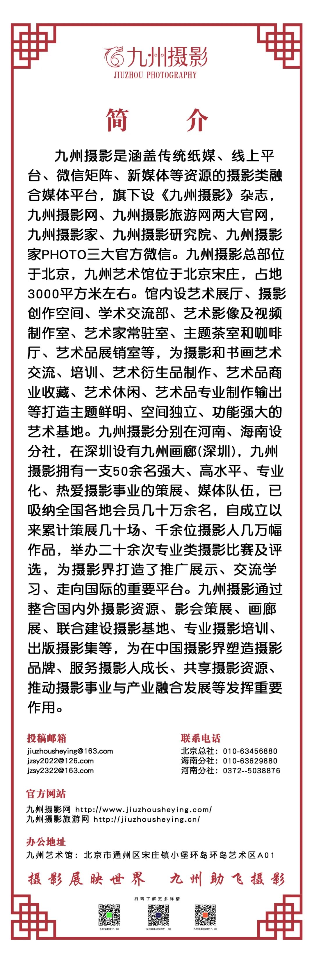 2.九州摄影将推荐优秀摄影师参加全国乃至国际巡展(北京国际摄影周、平遥国际摄影大展、丽水摄影节、九州国际摄影大展、大理国际影会、成都国际摄影周、斯里兰卡国际摄影大展、德国汉堡国际视觉影像博览会、德国科隆摄影节等国际影展)。3.优秀摄影师有机会获得在九州摄影旗下九州摄影网、九州摄影旅游网站,(http://www.jiuzhousheying.com)/(http://www.jiuzhousheying.cn)“九州摄影家、九州摄影研究院、九州摄影家PHOTO”三大官方微信公众号,视频号、抖音号等媒体宣传推广,九州摄影与央视、北京电视台及腾讯、今日头条、优酷等新媒体开展合作,进行全方位立体化报道展示。4.优先推荐优秀摄影师参加中国摄影家协会的“影像中国网”的“在线影展”,可积3分。5.优先推荐优秀摄影师加入中国摄影家协会北京摄影函授学院学习,可积3分。6.甄选并推荐优秀摄影师的作品荣登北京电视台《光影新视界》栏目展出。7.推荐摄影师直升九州摄影全国理事会会员享受全国百余家景点免门票。8.优先推荐优秀摄影师参加2024年度全球华人摄影金像奖。9.优先推荐优秀摄影师参加2024年度中国摄影十杰评选。10.优先推荐优秀摄影师参加美丽中国·美丽英国—2024国际艺术展。11.优先推荐优秀摄影师参加2023年度摄影奥斯卡终身成就奖评选。12.为优秀摄影师成长成才全方位策划包装、全球宣介推广。注:本系统只接收手机、相机、航拍摄影作品,谢绝视频作品。1.参赛所有入选作品的电子文档由九州摄影存档,不予退稿。参赛摄影师必须保证其作品的原创性,对该作品拥有独立、完整的著作权;作品不得侵犯第三人的包括著作权、肖像权、名誉权、隐私权等合法权益。作品题材、体裁均不得触犯中华人民共和国法律法规。如参展作品引起纠纷,一切法律责任均由参展摄影师承担。2.参赛所有入选作品,九州摄影有权于大展相关活动中使用(包括展出、巡展、学术交流、出版发行、媒体报道、网络传播等),不再向作者取得授权,不另付稿酬。3.参赛摄影师应遵守展场规定,不得擅自变更展览方案、展场环境、展览空间,不得擅自使用他人展位、移动他人展架,不得提前撤展。凡参赛摄影师、策展人、机构团体等,将被视为接受以上声明。本征稿启事解释权归九州摄影百名摄影师联展展区组委会所有。