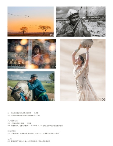28 75 37 79 103 82 潮人视觉摄影家吴秀霞师生联展——吴秀霞 102 人景同框相得益彰 画情共生意蕴悠长——吴江 九州摄影家 106 《弥留的痕迹》组图——刘存瀚 108 冰雪新世界,摄影新“镜”界——访 2022 第 22 届平遥国际摄影大展入展摄影师崔国 协会风采 112 “礼赞新时代,奋进新征程”喜迎党的二十大 2022 任丘摄影艺术展览——前言 活动 212 首届报国寺“锦绣九州·魅力时代”国际摄影、书画大展征稿启事