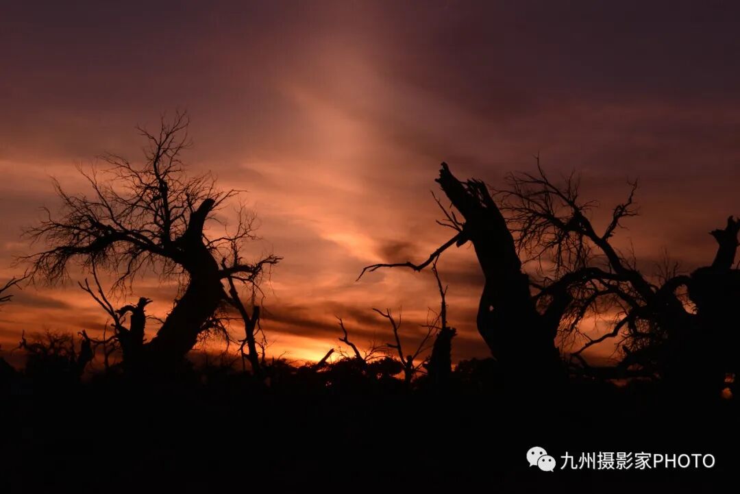 吴建明的魅力河山组特等奖作品《额济纳黑树林》采取背光拍摄,在背景为火烧云的映照下,枯木的暗部更加明显,参差不齐的树枝横入画面,组成一幅和谐而壮丽的作品。