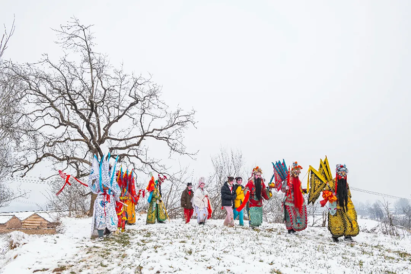 利用下雪后营造出一片洁白的世界。利用茫茫白雪作为场景中的主色调,在画面中精心布置主体元素来传达想要表达的内容。利用身着不同颜色戏服的演员为画面添彩,这样雪景照片看起来色彩就更丰富了。